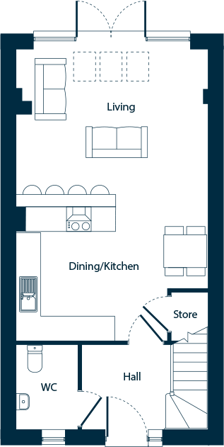 NOTE: Customers should note images (CGIs) are for illustrative purposes only. All room dimensions are approximate and furniture layout is for illustrative purposes. Homes may be ‘handed’ (mirror image) versions of illustrations, and could be detached, semi-detached or terraced. Material and specifications will vary from site to site and plot to plot, including rendering and roof colours. Detailed plans and specifications for each plot is available to view at our sales centre during working hours. Please consult with your Sales Executive to make your own enquiries to check individual property details and specifications before making a reservation.